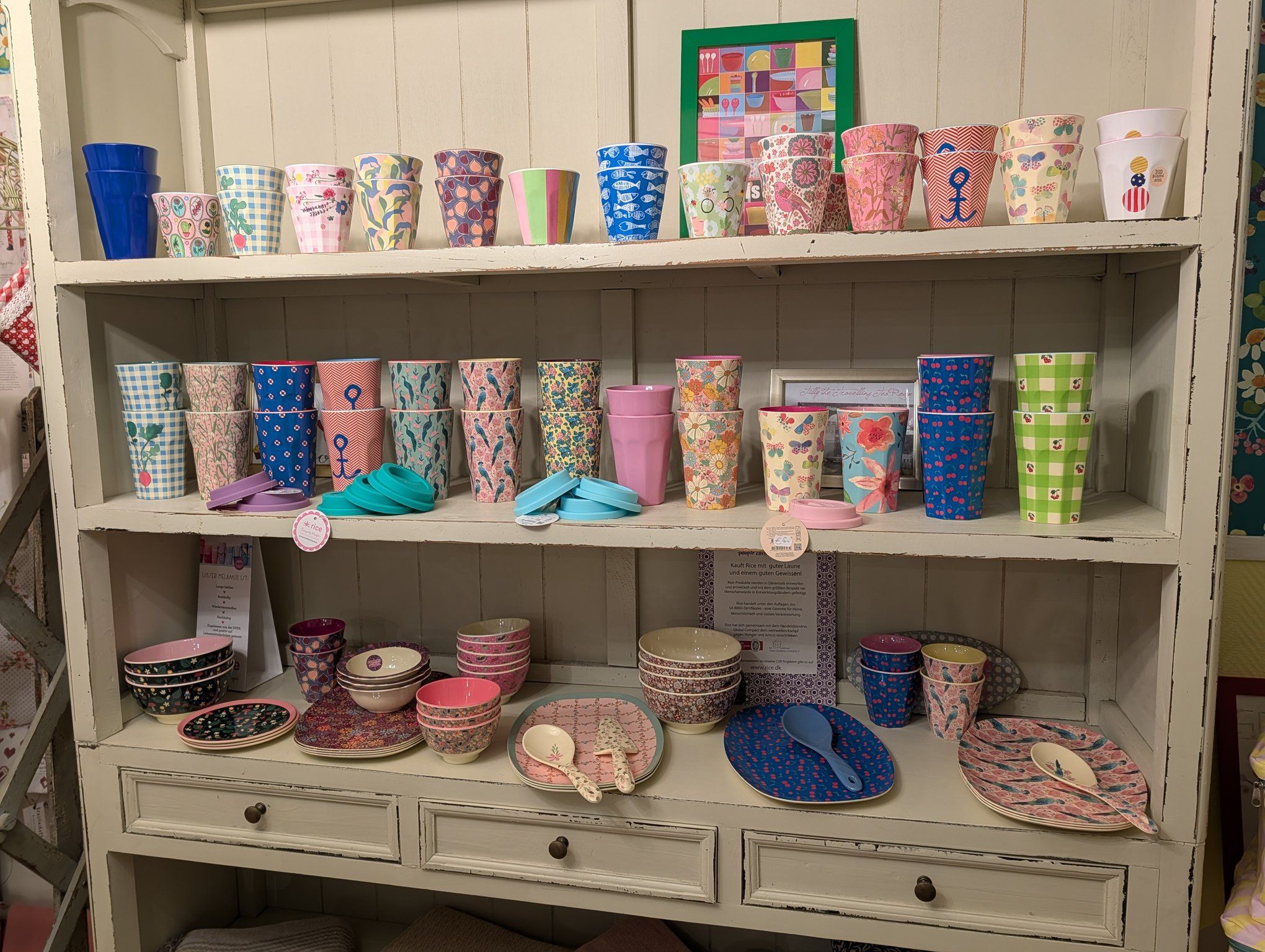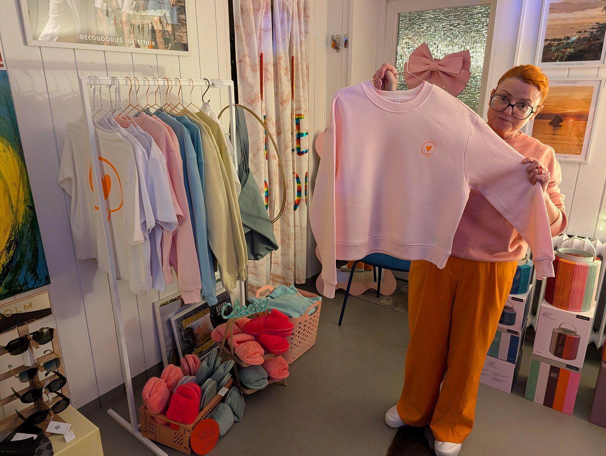 Starten wir in der Niendorfer Straße 21. Schon von außen leuchtet euch das Geschäft Deco Goodies entgegen. Wenn ihr, wie ich, diesen bunten und individuellen Stil liebt, werdet ihr hier wahrscheinlich Schnappatmung bekommen – vor Freude! Stephanie und Chris haben hier eine Oase für Designliebhaber geschaffen. Es ist nicht überladen, sondern kuratiert. Man merkt sofort: Jedes Teil hier wurde mit Liebe ausgesucht. Die Stücke kommen aus Dänemark, Spanien oder Portugal. Besonders toll finde ich die lokale Note: Sie haben eine eigene „Fehmarn forever“-Kollektion mit Postern und Postkarten. Das sind keine kitschigen Souvenirs mit Wackelbildern, sondern ästhetische Fotografien und Grafiken, die man sich wirklich gerne ins Wohnzimmer hängt. Es ist der perfekte Laden, um ein Geschenk zu suchen – und am Ende mit drei Dingen für sich selbst rauszugehen. Die Atmosphäre ist locker, man kommt schnell ins Schnacken und fühlt sich einfach willkommen.