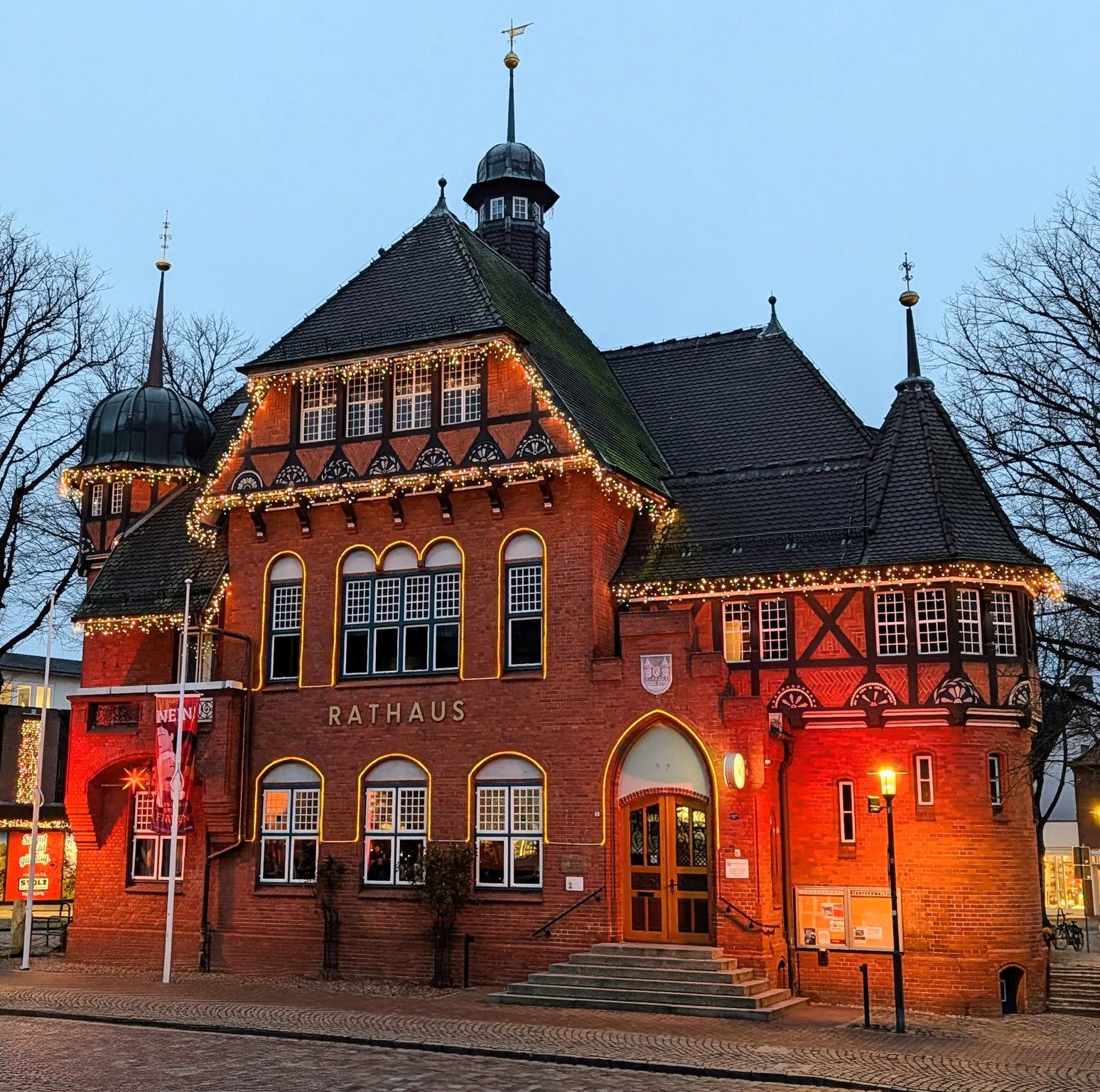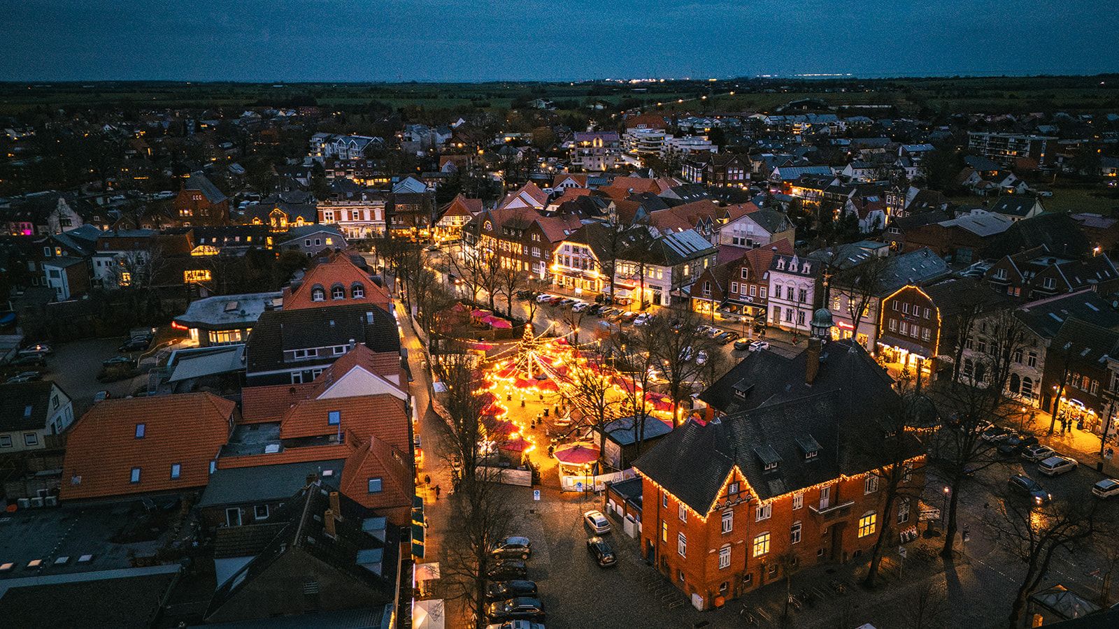 Vergesst die riesigen Weihnachtsmärkte in Hamburg oder Lübeck, wo man sich nur durch die Massen schiebt. Der Weihnachtsmarkt in Burg ist anders. Er ist das Herz der Insel im Winter. Stellt euch vor: Der historische Marktplatz, eingerahmt von den alten Backsteinhäusern und dem Rathaus. Über euch spannen sich Lichterketten durch die alten Bäume, die den ganzen Platz in ein warmes, goldenes Licht tauchen. Der Boden ist mit Hackschnitzeln ausgelegt und in der Mitte steht der große beleuchtete Weihnachtsbaum.