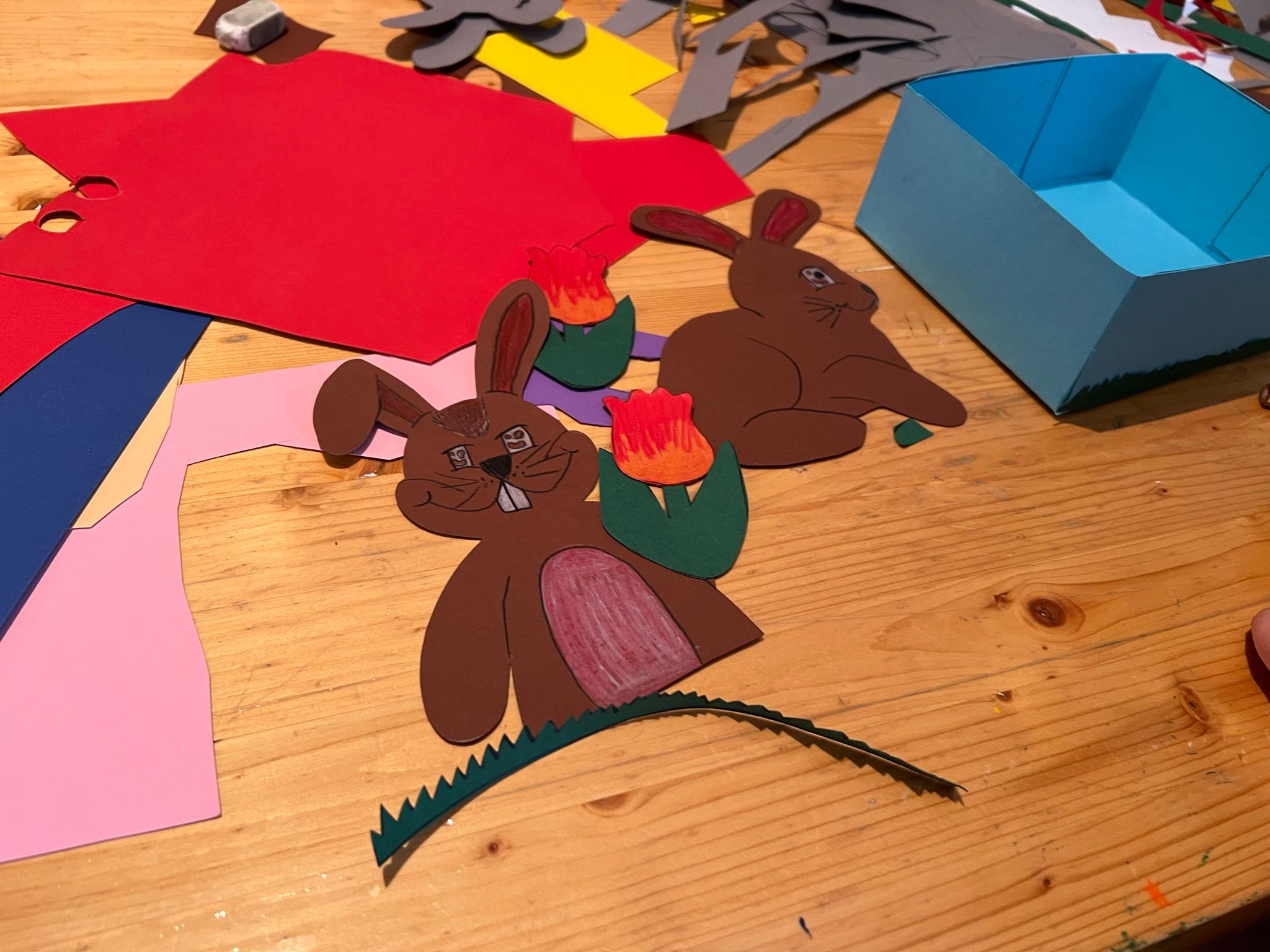 Ob mit Hasenohren, Kükenmotiven oder frühlingshaften Blumen – hier darf gebastelt, geklebt und gestaltet werden, was das Zeug hält.