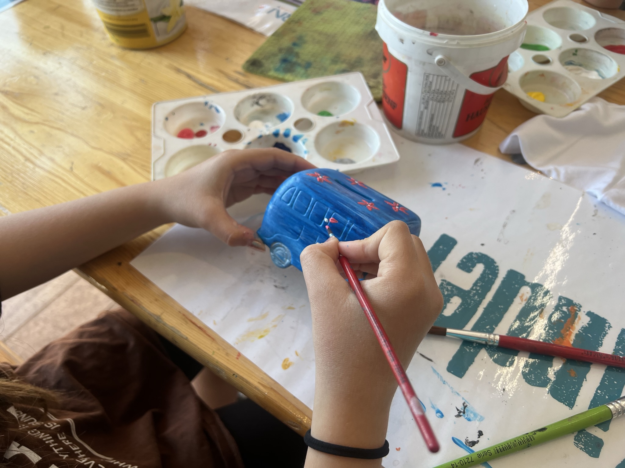 Ein bemalter Porzellan-Regenbogen auf einem Tisch mit Farbpaletten, einem Joghurtbecher und einem Schwamm.