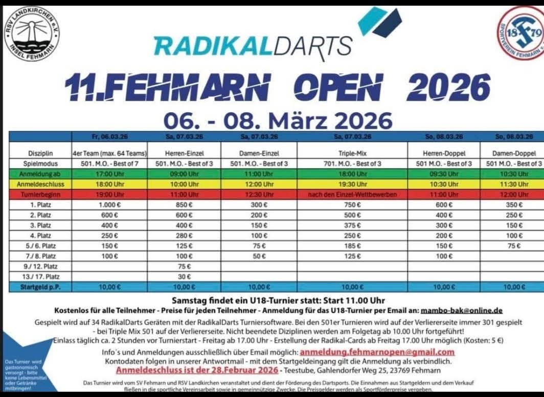Radikal Darts - 11. Fehmarn Open 2026 vom 6. - 8. März in der Großsporthalle in Burg.