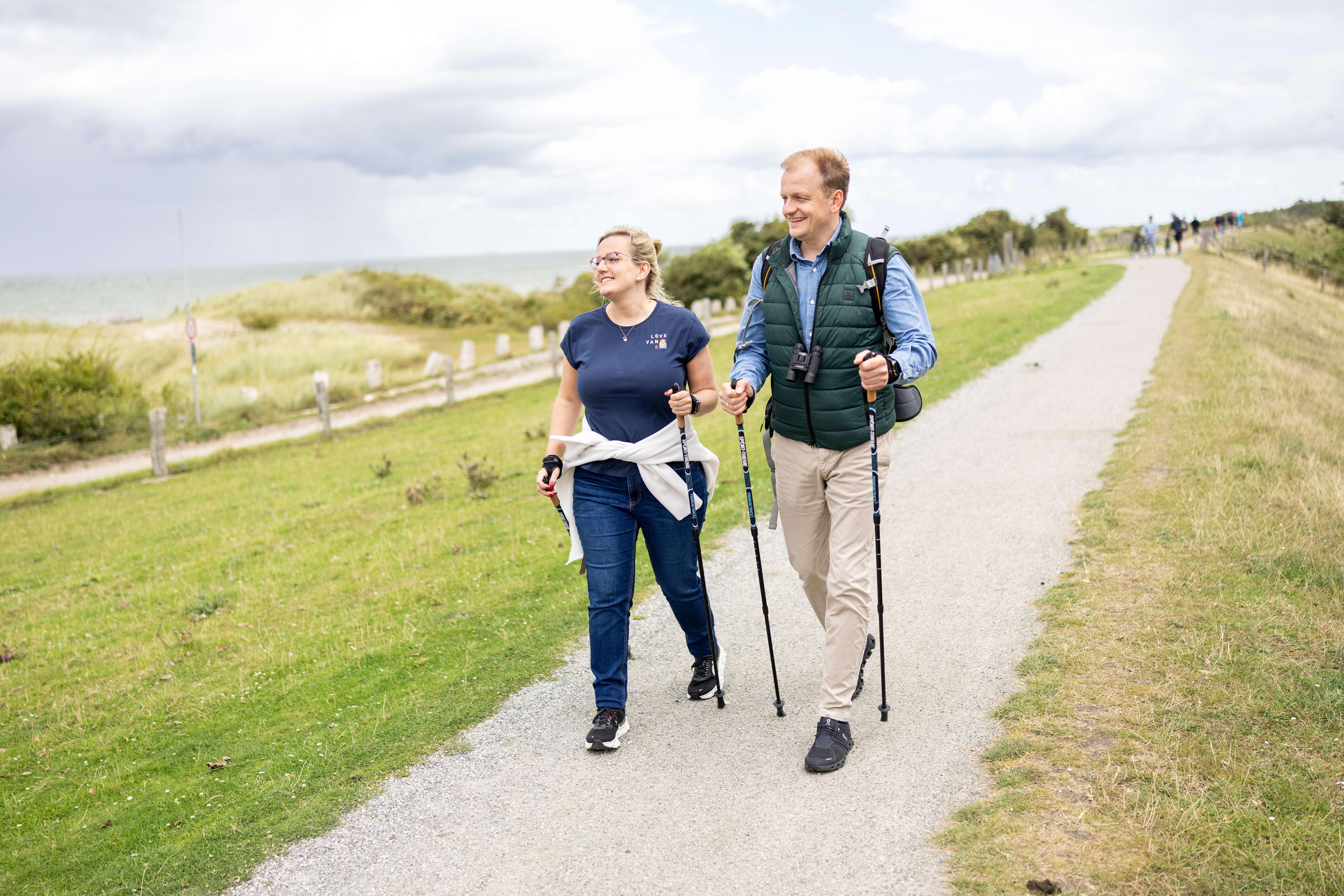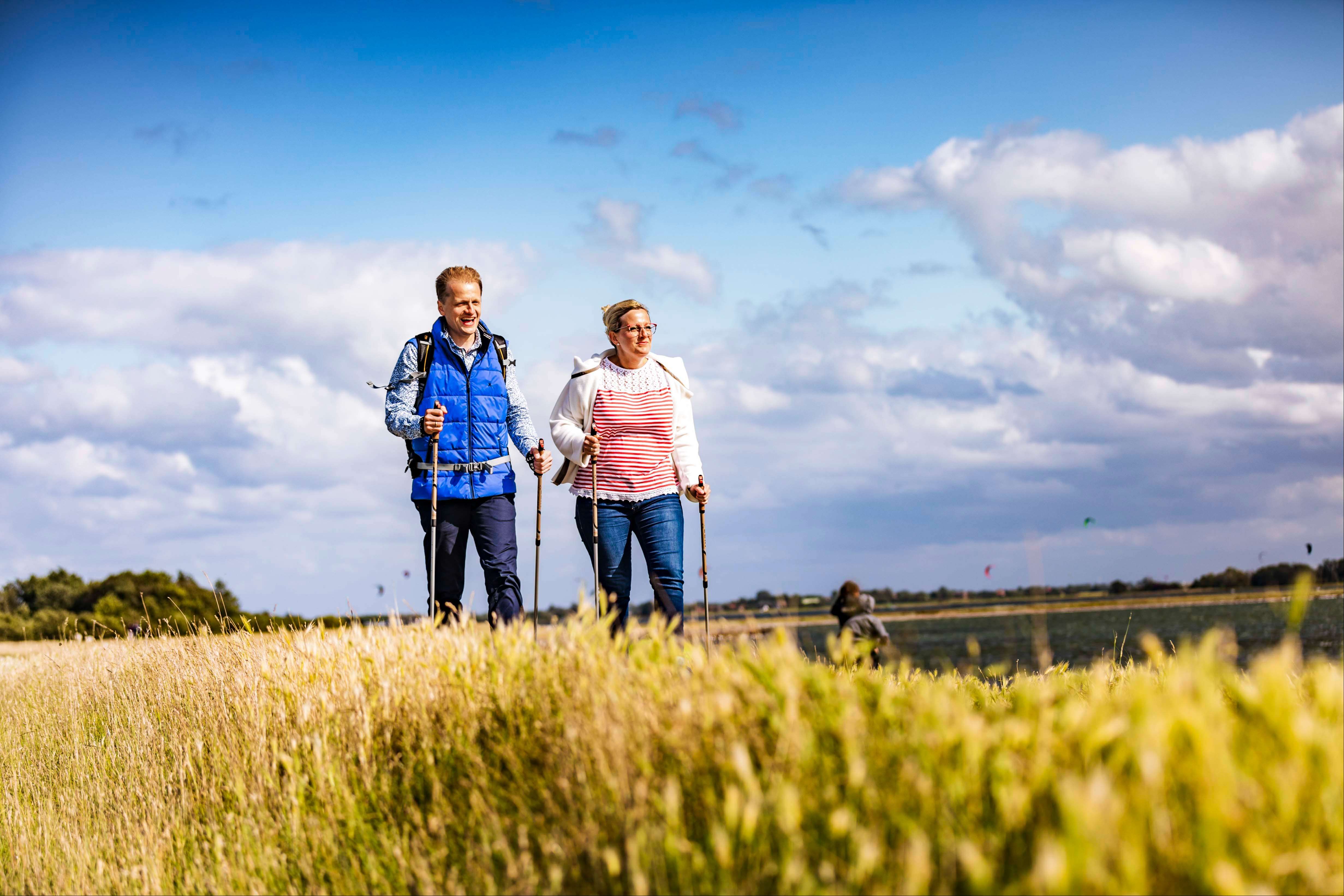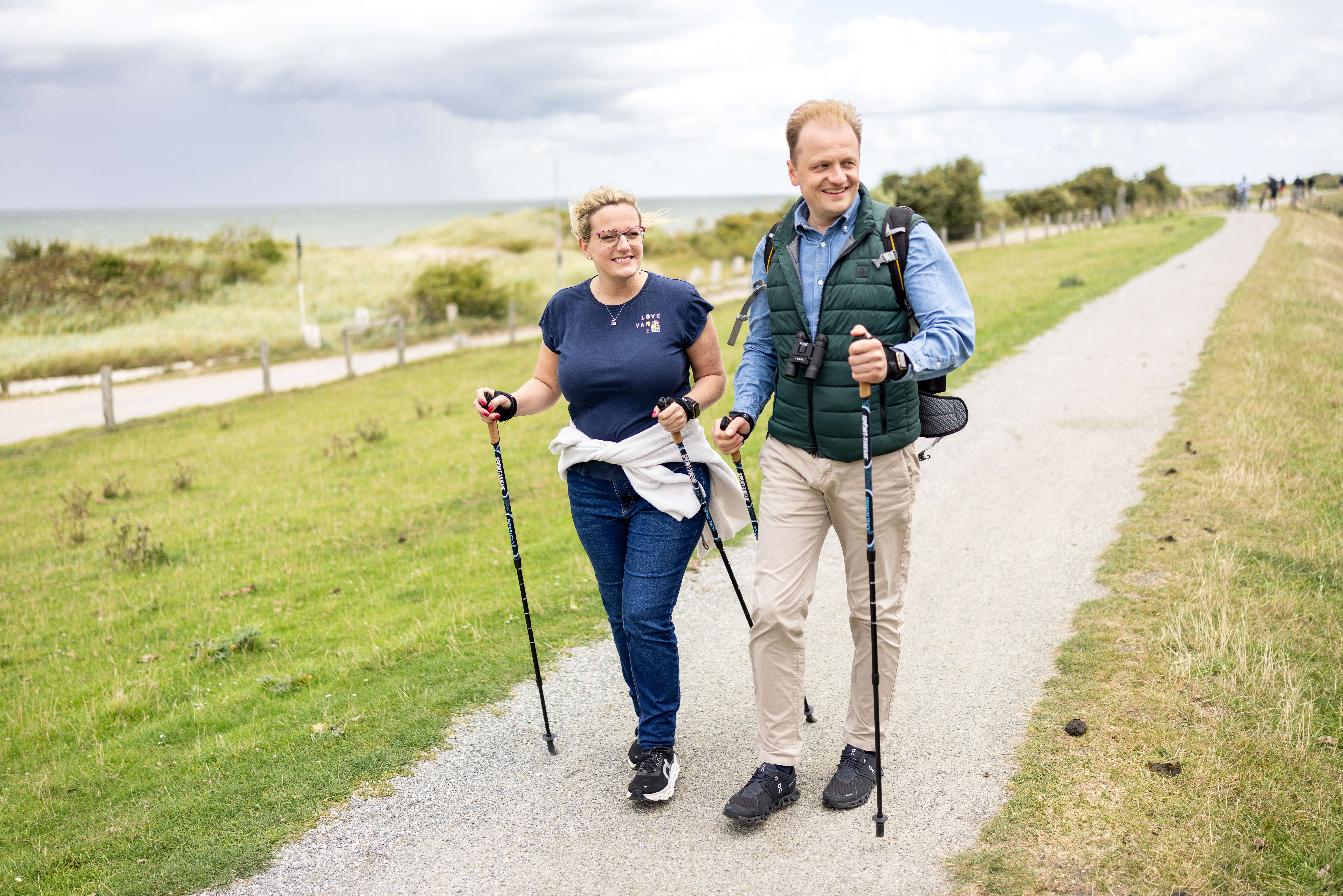 - Ein Paar Wandert mit Nordic Walking Stöcken auf dem Deich in Altenteil