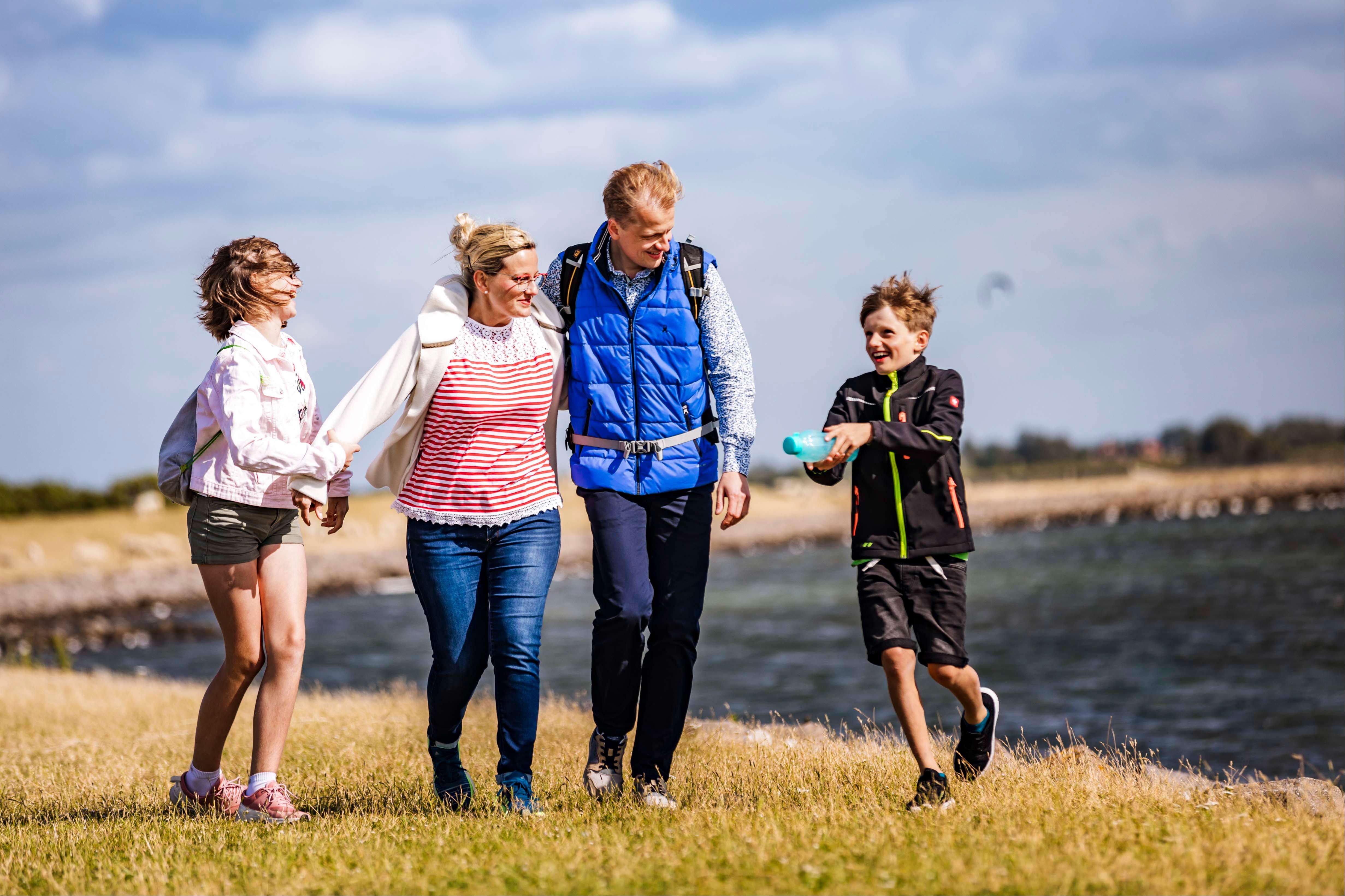 - Eltern gehen mit ihren zwei Kindern auf dem Deich spazieren