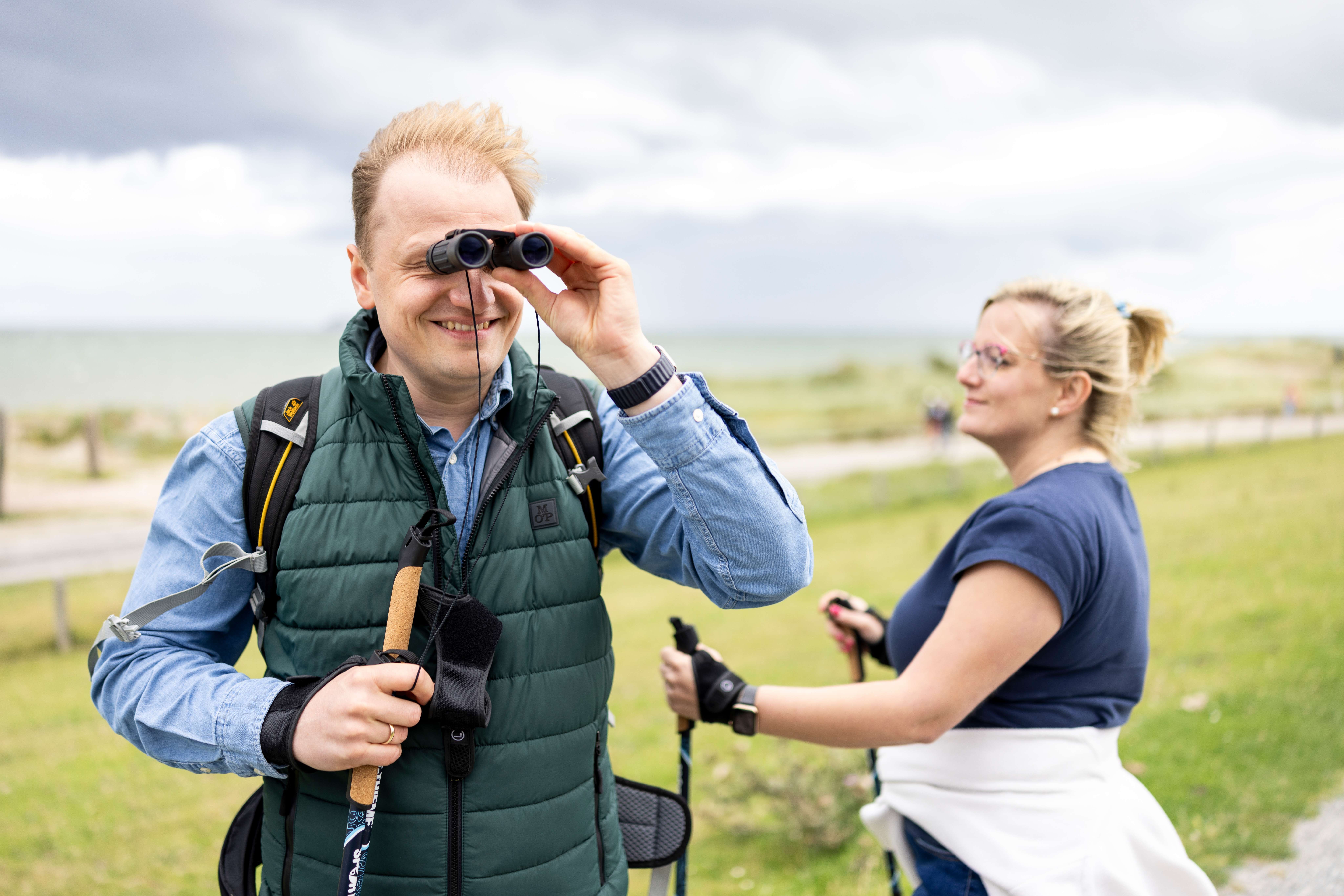 Thies Rätzke Thies Rätzke - Ein Mann schaut durch ein Fernglas, die Frau steht im Hintergrund und schaut auf das Naturschutzgebiet