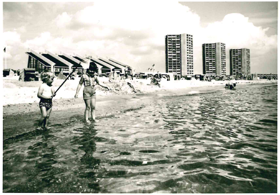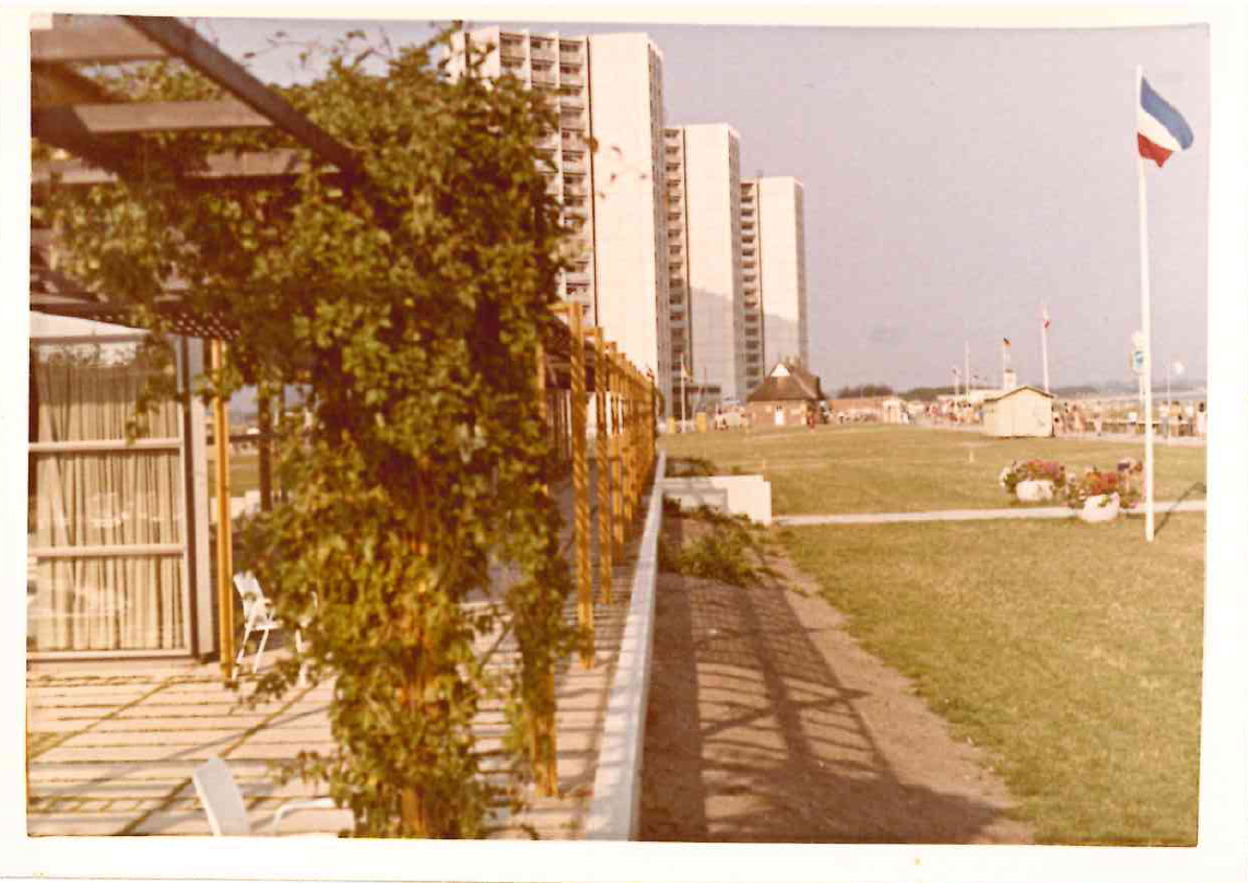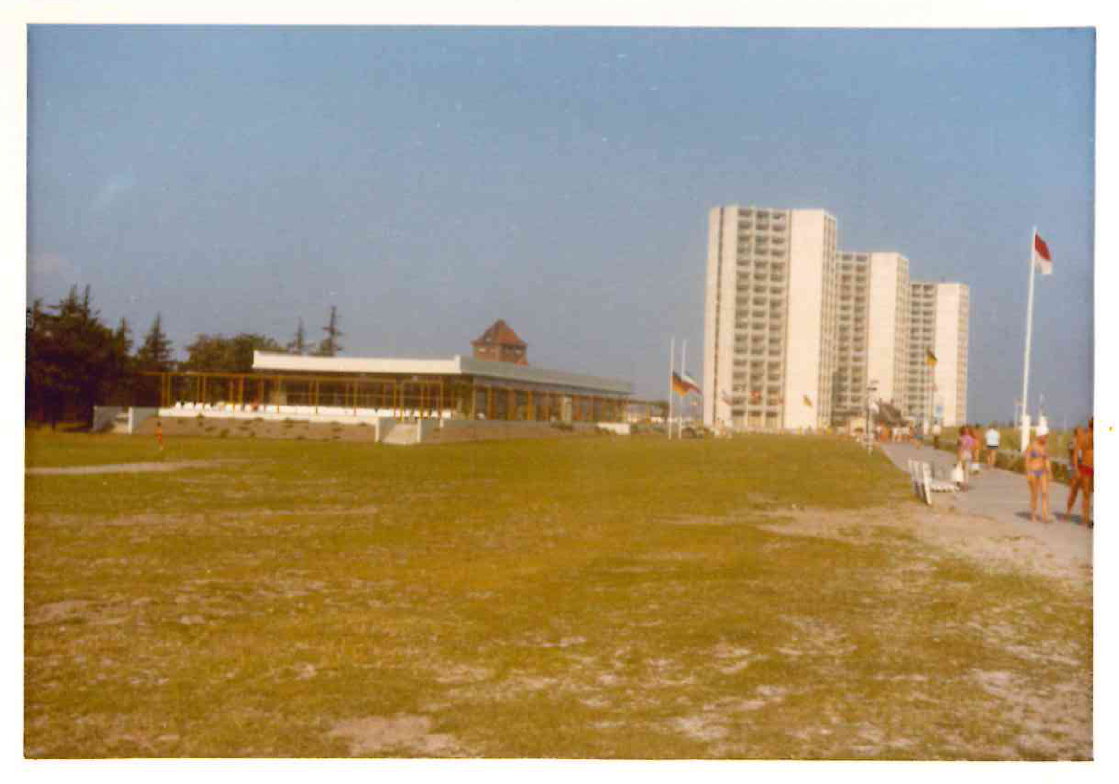 - Archivbild von Personen am Südstrand in Burgtiefe mit FehMare und dem heutigen IFA-Hotel