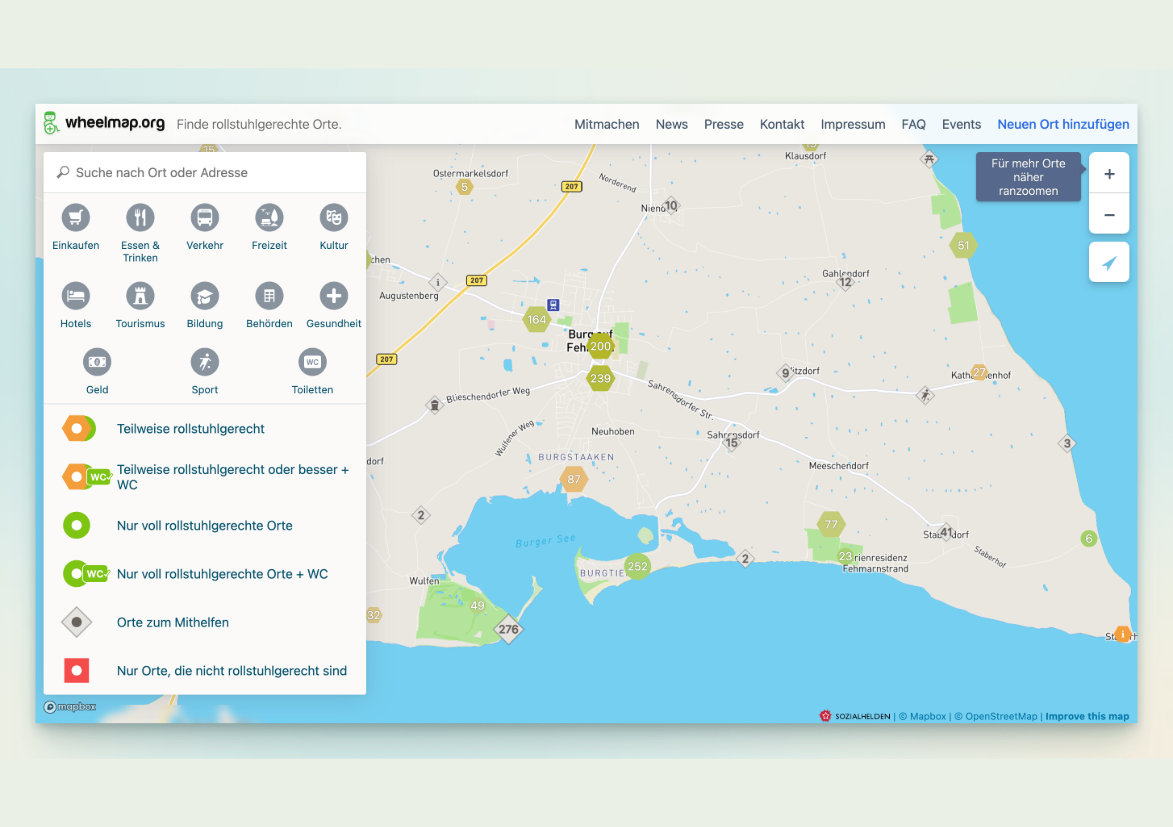 Online-Karte “wheelmap”: Die Online-Karte “wheelmap” markiert und findet rollstuhlgerechte Orte. Mit Hilfe eines einfachen Ampelsystems werden öffentlich zugängliche Orte markiert, die barrierefrei sind (grün = voll rollstuhlgerecht / gelb = teilweise rollstuhlgerecht / rot = nicht rollstuhlgerecht).